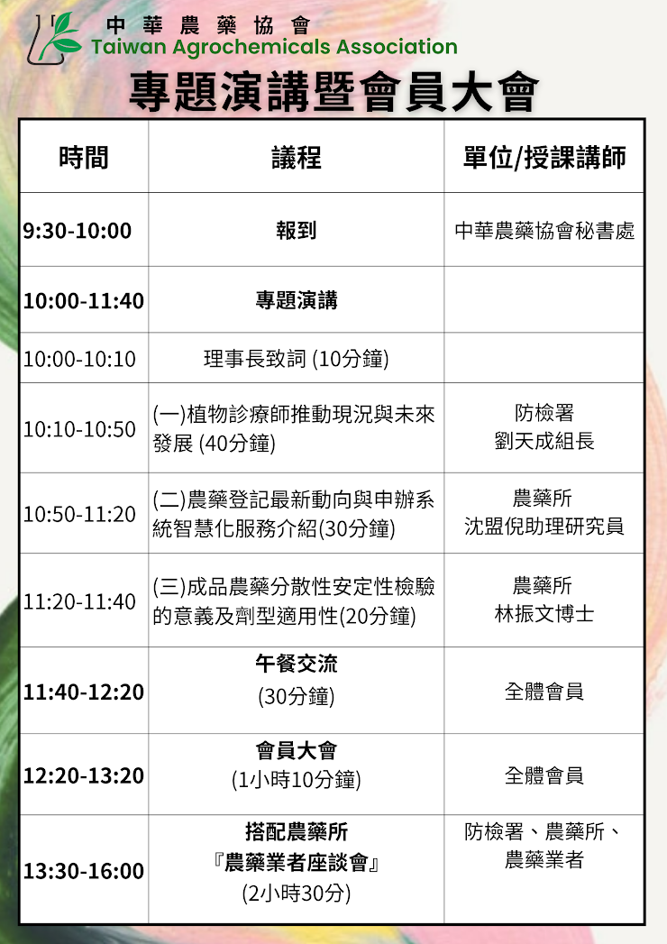本會擬召開第10屆第114年度專題演講暨會員大會,特別邀請動植物防疫檢疫署及農業藥物試驗所專家進行專題報告,內容涵蓋植物診療師制度推動現況、農藥登記最新動向,以及成品農藥檢驗實務等主題,請各位會友踴躍參與。